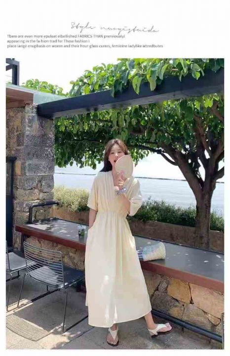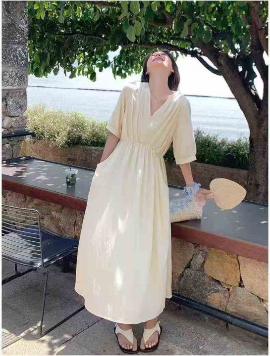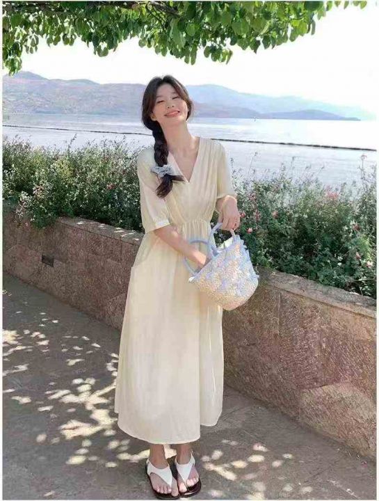 复古别致V领收腰显瘦杏色连衣裙,[爱心]50件左右,码数S-XL,穿80-130斤,万佳档口货,原包装️无瑕疵,(模特图仅供参考),[666]实体店品质。 货号:1323
