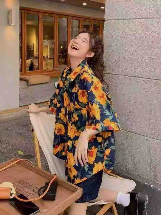 港风复古女士印花宽松显瘦设计感小众中长款短袖衬衫,单款单色,独立包装,...