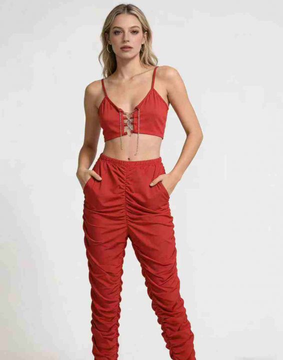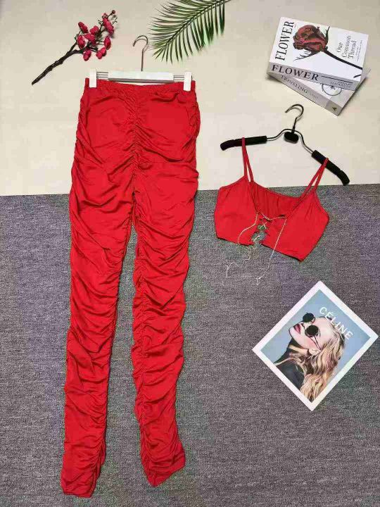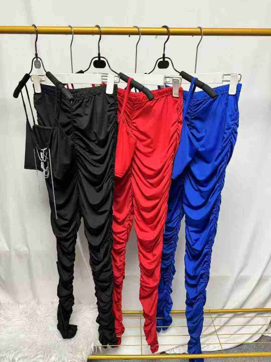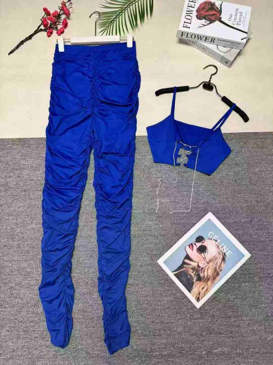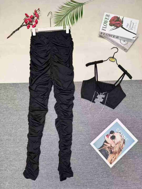 欧美时尚辣妹性感吊带+褶皱长裤两件套,整款三色,数量:217套,码数:S-2XL,品质好,有独立包装。