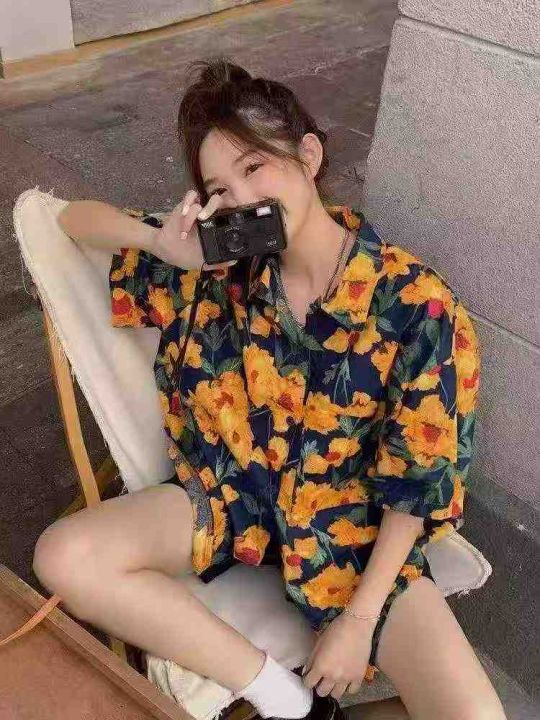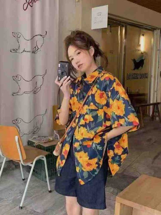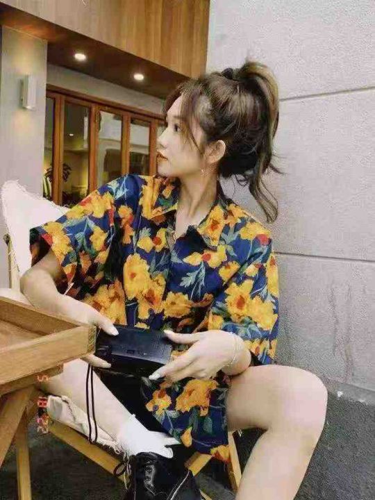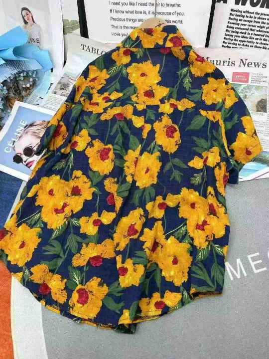 港风复古女士印花宽松显瘦设计感小众中长款短袖衬衫,...
