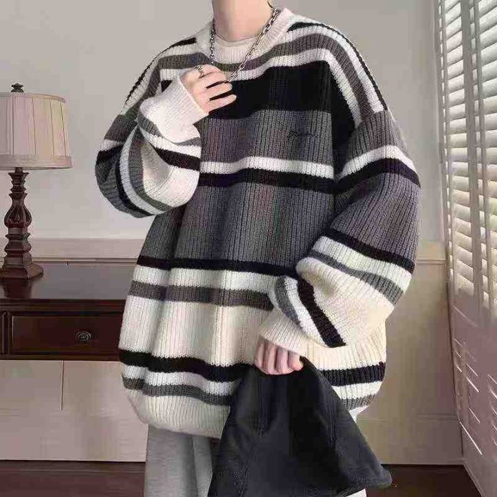 ☆7.8元,秋冬季慵懒风情侣百搭条纹宽松圆领毛衣,男...