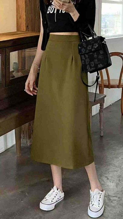 春夏新款网红a字遮胯显瘦中长款半松紧腰开叉冰丝顺滑...