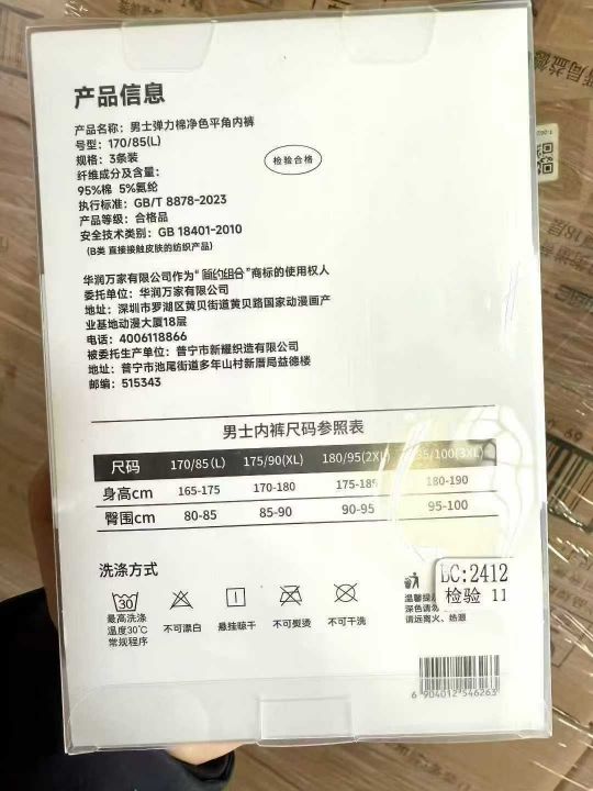男士平角内裤华润万家自有品牌内裤5000 盒一盒 3 条装 25 年生产的 L码...