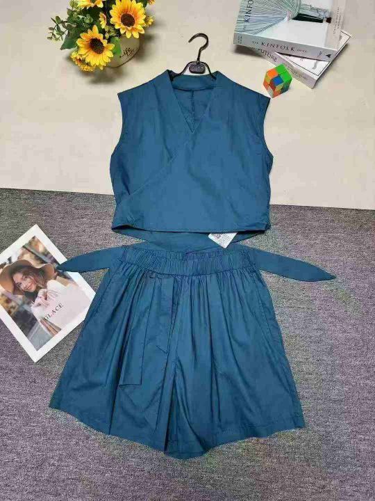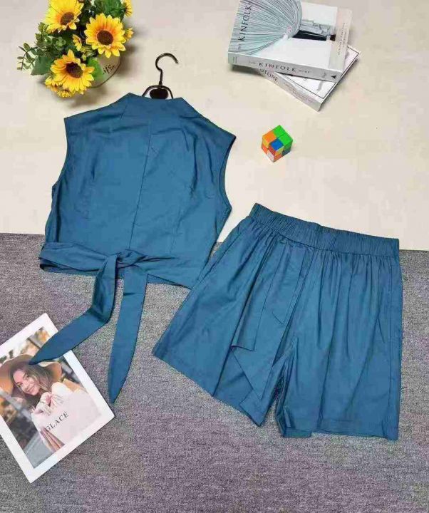 时尚亚麻上衣网红款阔腿短裤两件套,舒适蓝色,单款单色,品质好,有独立包装带吊牌,码数S- XL,数量310套,全清8.8元秒。