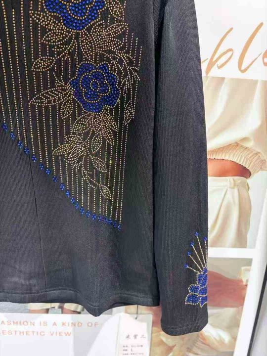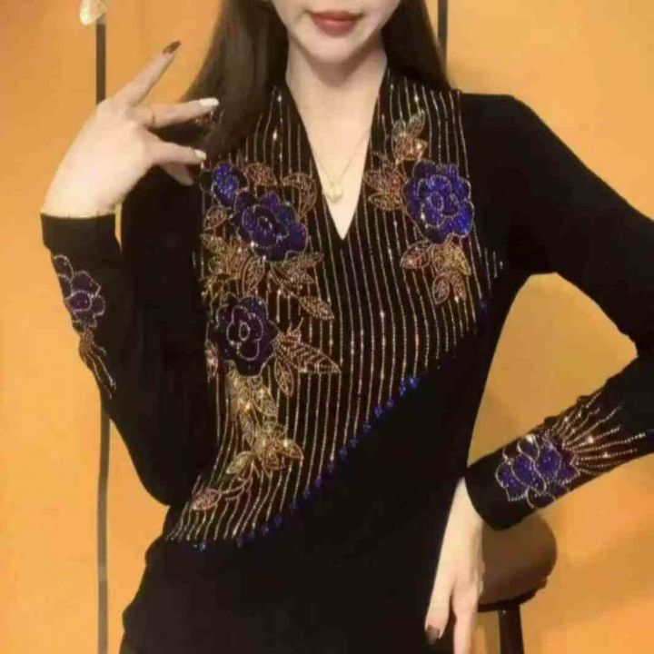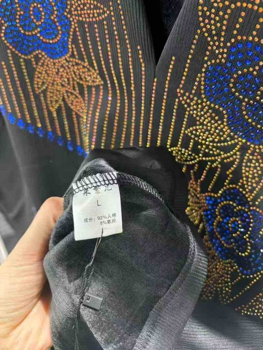 110件高端爆闪贵妇V领烫钻潮流新款时尚修身显瘦洋气加绒打底衫上衣,内里加婴儿绒,做工品质很好,高弹力,尺码S-4XL,独立包装,全清10.5 不分货。 货号:1323