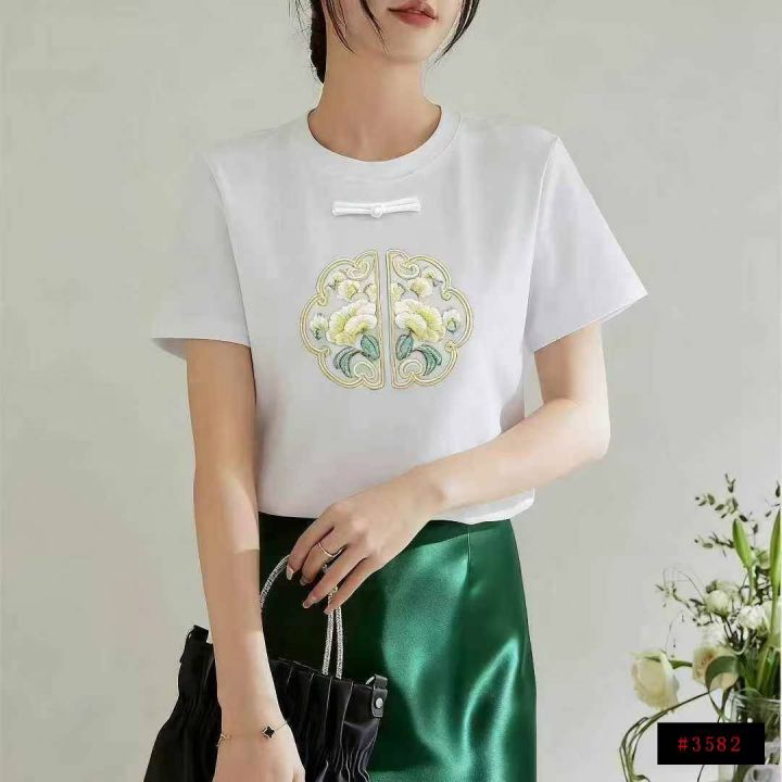 1625件国风重工刺绣中式盘扣拉架棉短袖T恤女,以黑色...