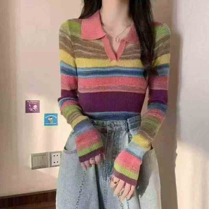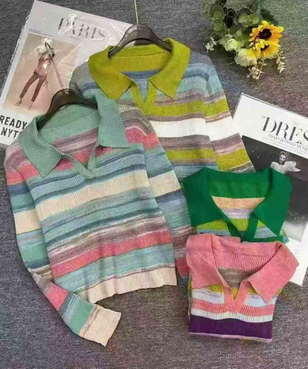 秋季新款POLO领撞色彩虹条纹微胖MM设计感时尚宽松长袖套头毛衣羊毛衫,独立包装,均码宽松款面料软糯Q弹,1800件,全清8.9元超低价秒杀!分货加一!