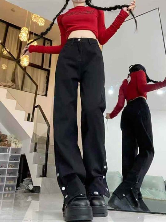 秋冬新款黑色宽松百搭排扣设计款洗水棉牛仔直筒烟管裤...