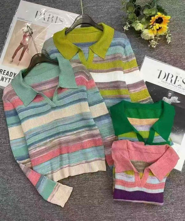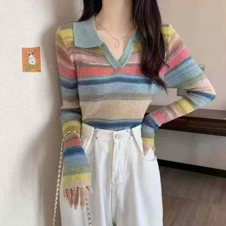 秋季新款POLO领撞色彩虹条纹微胖MM设计感时尚宽松长袖套头毛衣羊毛衫,独立包装,均码宽松款面料软糯Q弹,1800件,全清8.9元超低价秒杀!分货加一!