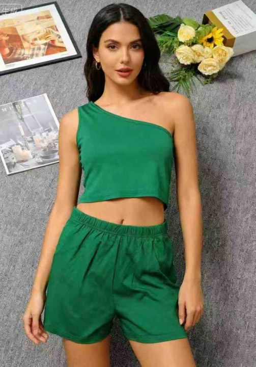 工厂回收84套外贸热卖绿色斜肩吊带短裤套装,码数S-XL。面料有弹性,全部独立包装。。 货号:1323