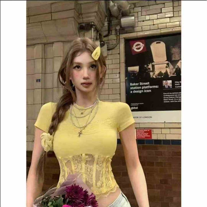 甜辣芭莉 蕾丝拼接短袖T恤女设计感辣妹性感纯欲修身显...