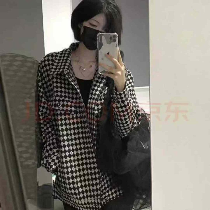 贝吉棋春秋款外套女ins美式复古棋盘格子polo领外套,...
