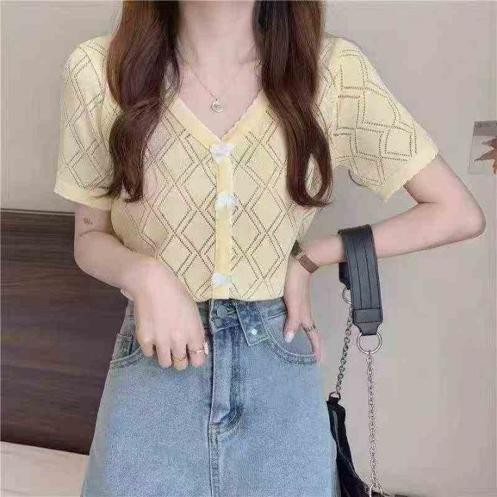 夏季新款镂空冰丝蝴蝶结设计感小众别致针织小衫,独立包装,均码面料柔软舒...
