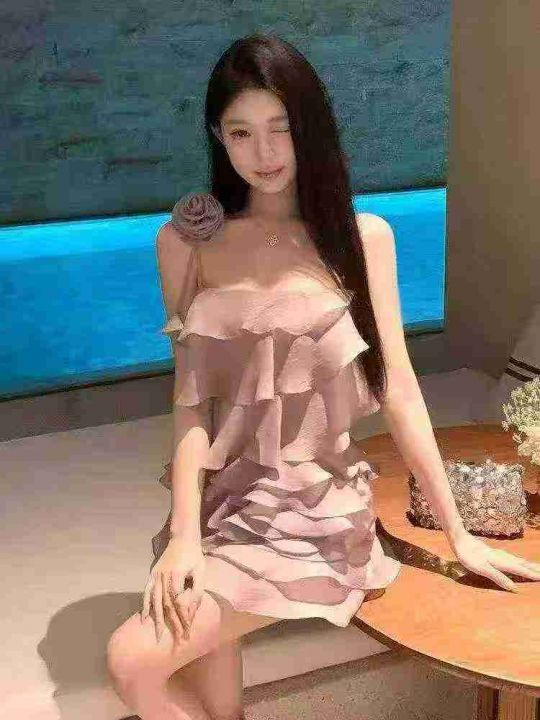 ☕️仙女裙辣妹不规则荷叶边吊带连衣裙短款花朵纯欲海边度假一字领雪纺连衣...