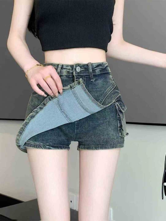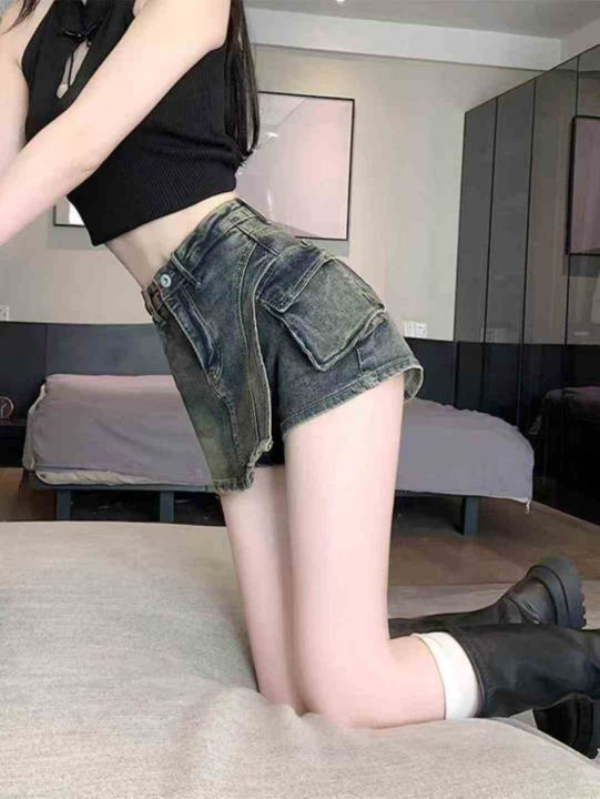 春夏新款辣妹高腰显瘦工装口袋做旧设计复古牛仔裙裤包...