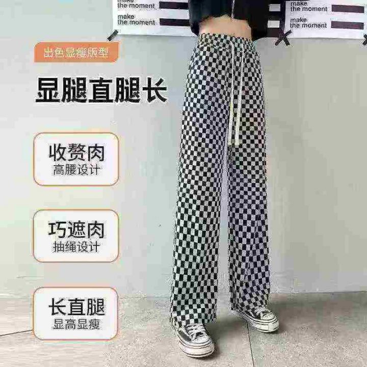 冰丝棋盘格裤子女夏季薄款高腰显瘦垂感休闲阔腿裤 有...