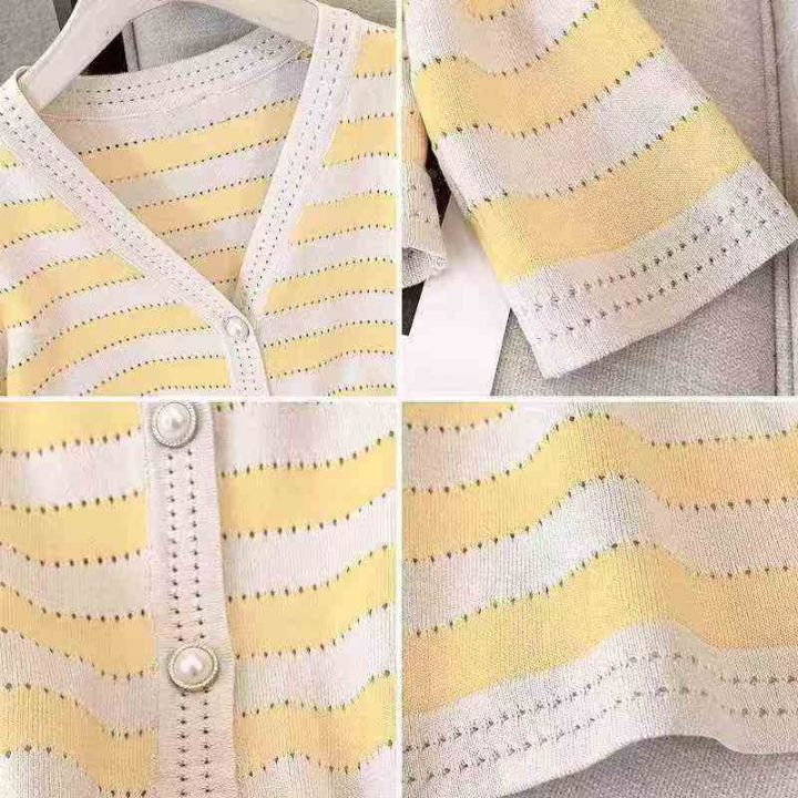 秋季条纹v领宽松小香风设计感遮肚显瘦长袖针织开衫,...