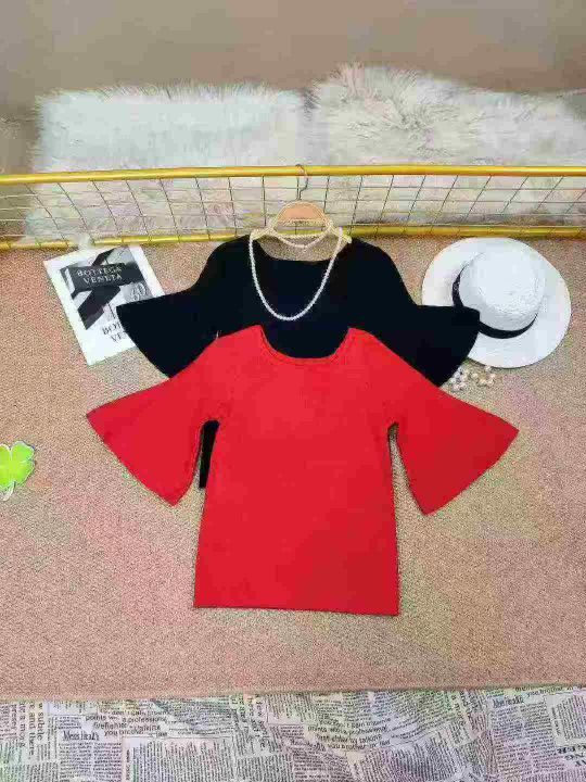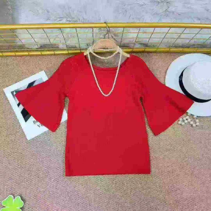 夏款 圆领五分袖短款冰丝针织衫女装时尚套头喇叭袖打底衫上衣,数量110件,单款两色,高弹面料。含70%的纤细羊毛,30%纤维,全部独立包装,均码(可穿120斤以内)低价6.9秒杀