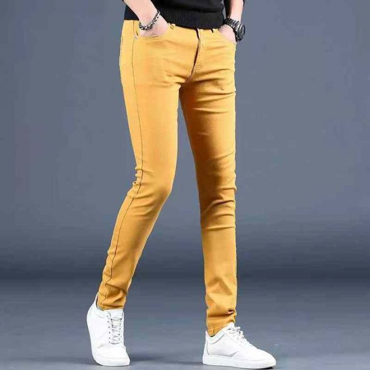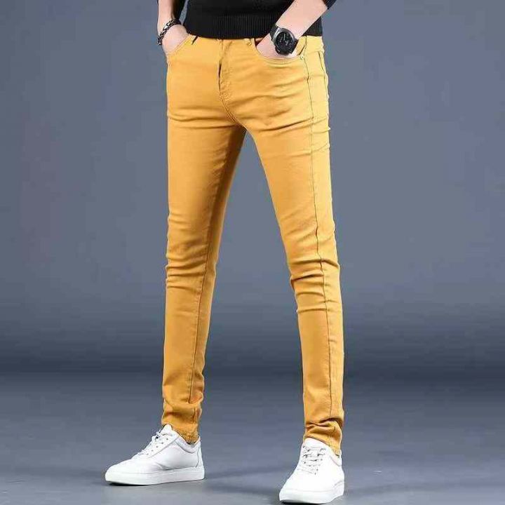 秋季新款高端弹力男士潮牌修身潮流黄色休闲牛仔裤,独...