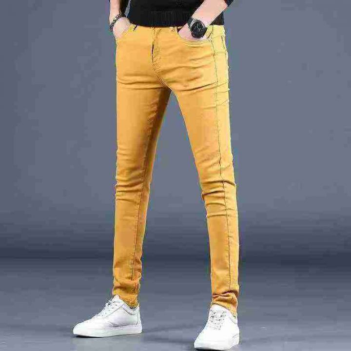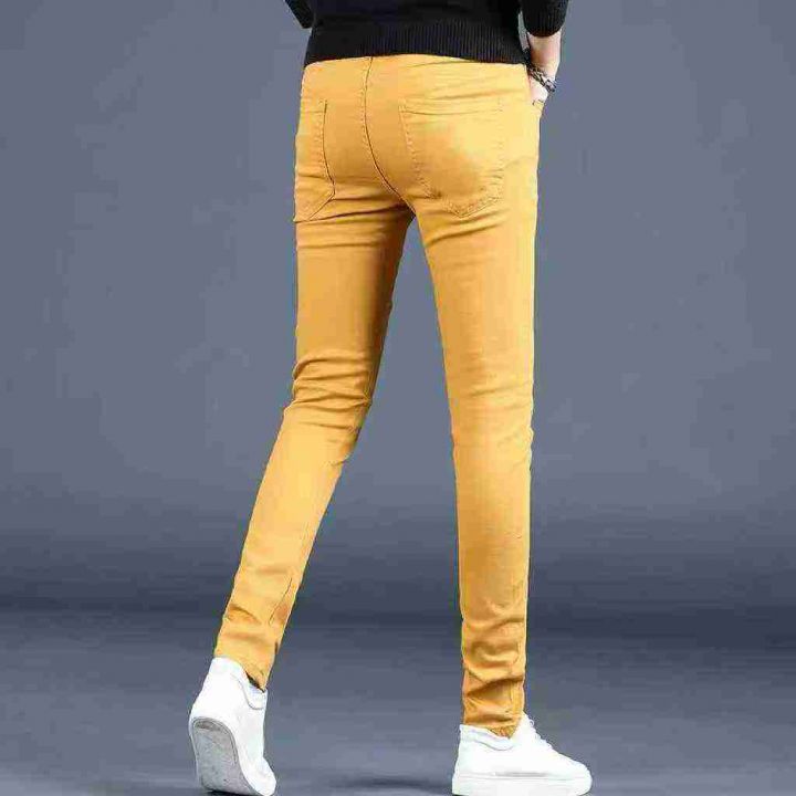 秋季新款高端弹力男士潮牌修身潮流黄色休闲牛仔裤,独...