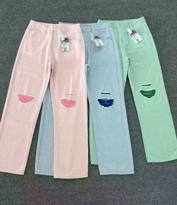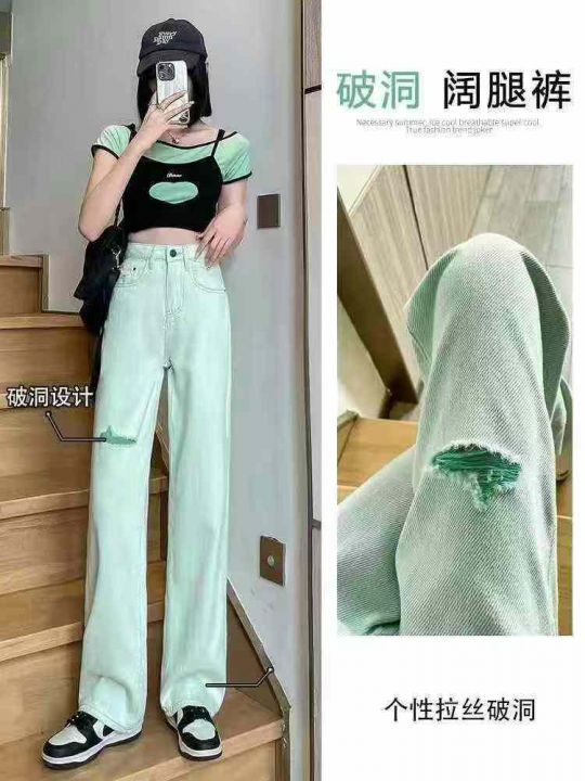 夏日马卡龙色系牛仔阔腿裤☕️1800条全清12.8 分货13.8 码数XS到XXL,有码数清单,两种长度有尺寸表,独立包装,美式复古破洞直筒牛仔裤女高街ins潮设计感小众高腰阔腿拖地裤子