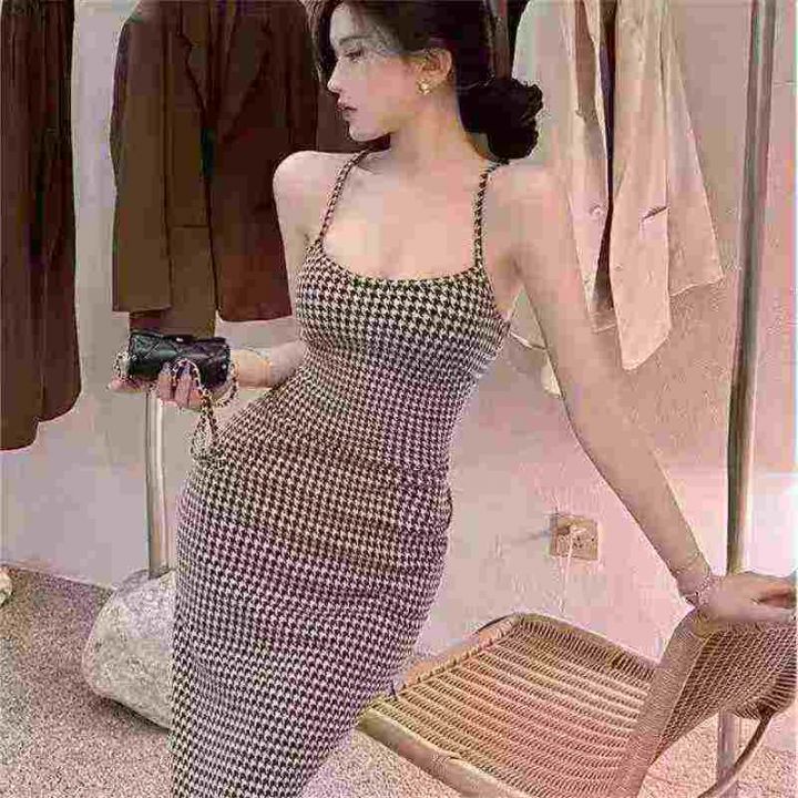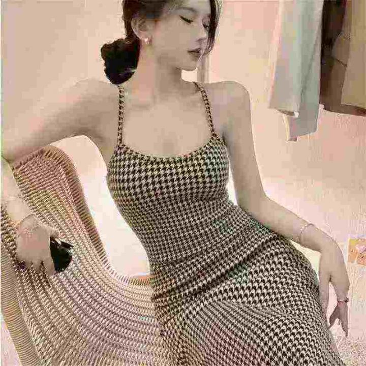 9.9清118件高级感复古千鸟格吊带连衣裙女夏季纯欲风性...