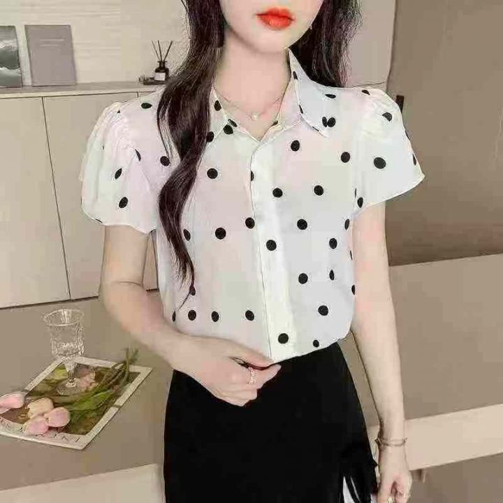 品牌高级感气质波点百搭小飞袖衬衣,[爱心]120件左右,码数S-2XL,穿80-140斤,万佳档口货,原包装️瑕疵,[666]分货加一。 货号:24862
