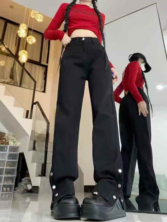 秋冬新款黑色宽松百搭排扣设计款洗水棉牛仔直筒烟管裤...