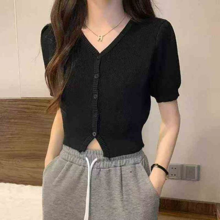 夏季新款法式V领短款收腰显瘦泡泡袖独特小众设计感针织短袖开衫,独立包装...
