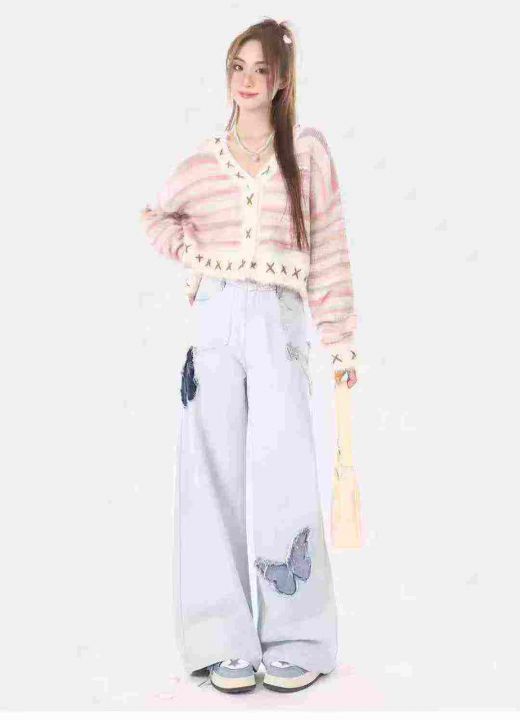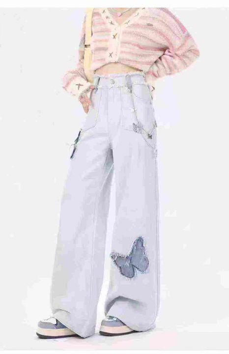 天猫精选1500条 时尚洋气国潮蓝色蝴蝶刺绣毛边阔腿牛...