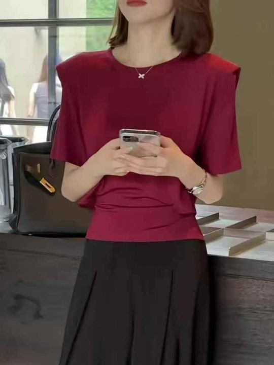 气质名媛风高级感酒红色法式绑带显瘦短袖上衣,单款单...