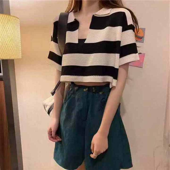 夏季新款撞色条纹宽松短款Polo领针织短袖,独立包装,均码年龄柔软舒适,16...