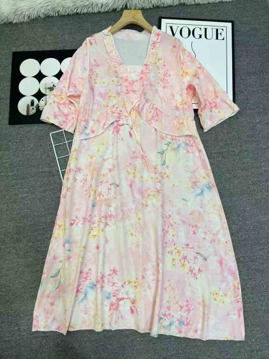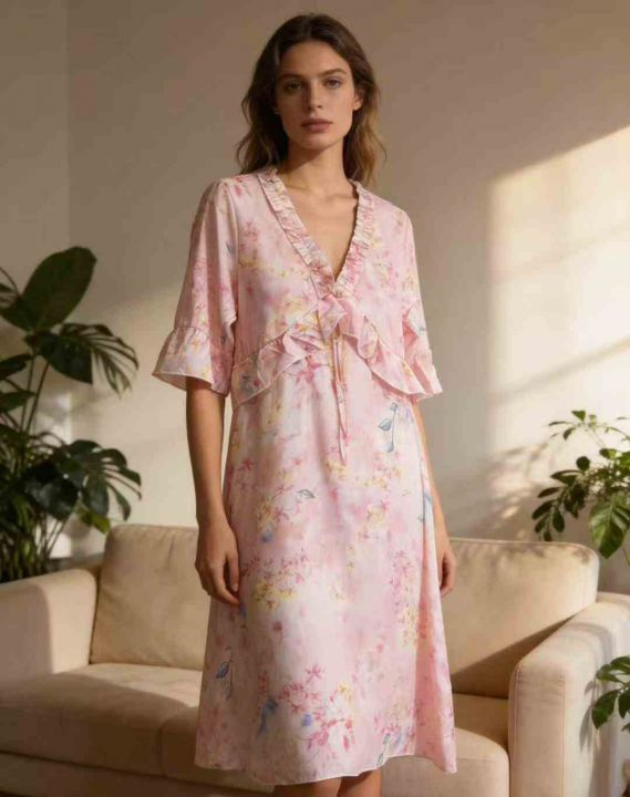 度假绵绸,V领连衣裙遮肉收腰时尚粉色减龄气质长裙通...
