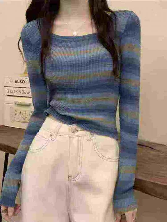 320件法式春秋季修身显瘦条纹长袖针织衫上衣,独立包...