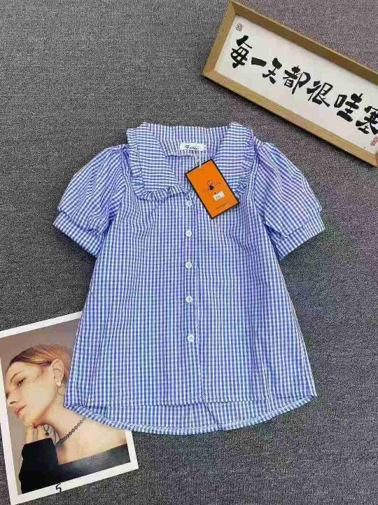 港味复古休闲衬衫121件7.9,娃娃领,泡泡袖,气质格子衬衫,码数S-5XL,独...