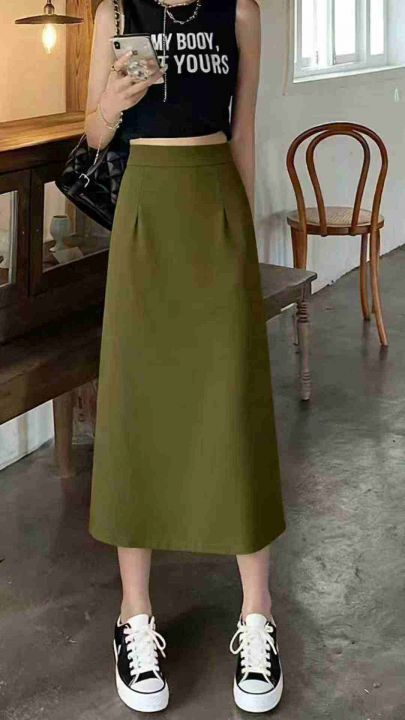 春夏新款网红a字遮胯显瘦中长款半松紧腰开叉冰丝顺滑...