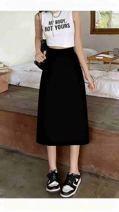 春夏新款网红a字遮胯显瘦中长款半松紧腰开叉冰丝顺滑...