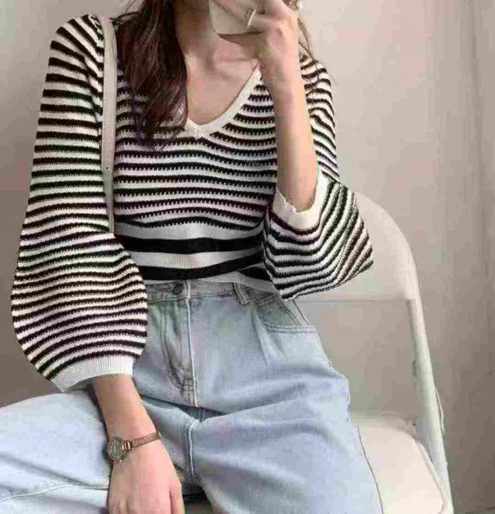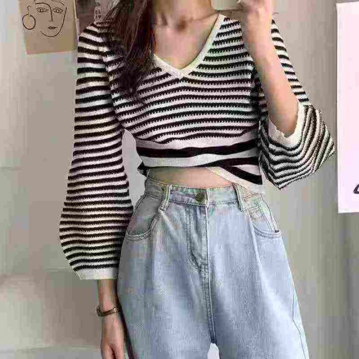 秋季新品撞色条纹宽松慵懒风短款针织V领套头毛衣,独...