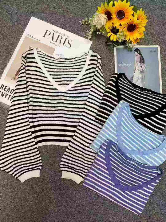 秋季新品撞色条纹宽松慵懒风短款针织V领套头毛衣,独立包装,均码面料柔软舒适弹力大,130件,全清5.9元超低价秒杀!