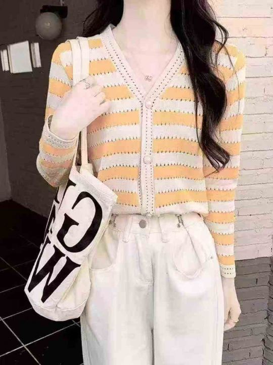 秋季条纹v领宽松小香风设计感遮肚显瘦长袖针织开衫,...