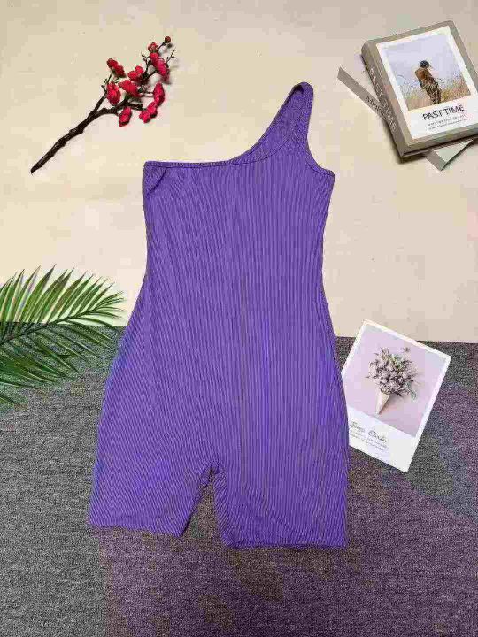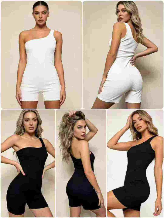欧美时尚纯色冰丝斜肩短裤连体衣,整款五色,数量:436套,码数:S-2XL,高弹力品质好,有独立包装。