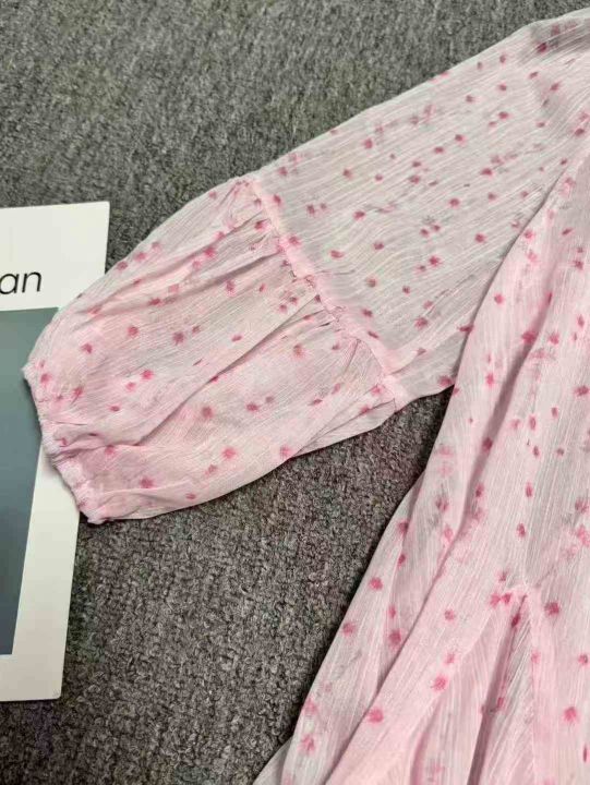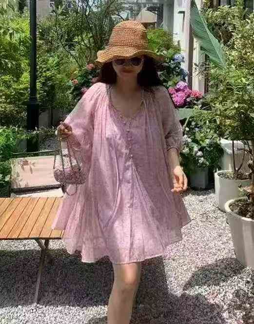 法式复古粉色碎花连衣裙女夏季甜美时尚海边度假宽松收...