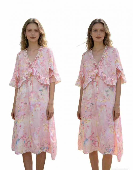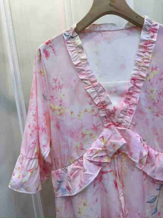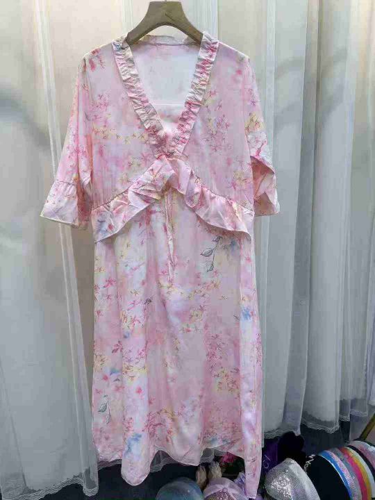 度假绵绸,V领连衣裙遮肉收腰时尚粉色减龄气质长裙通勤,独立包装,码数1234mlxlxxl,数量2840件,全清6.5元,分货➕1