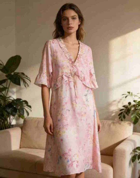 度假绵绸,V领连衣裙遮肉收腰时尚粉色减龄气质长裙通...