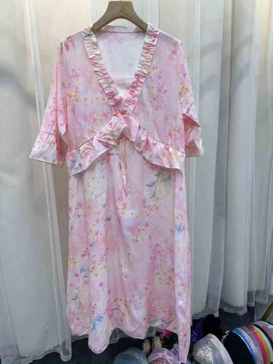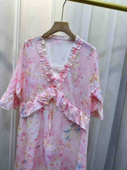 度假绵绸,V领连衣裙遮肉收腰时尚粉色减龄气质长裙通勤,独立包装,码数1234mlxlxxl,数量2840件,全清6.5元,分货➕1。 货号:24862