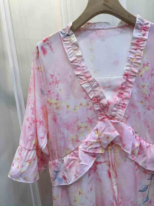 度假绵绸,V领连衣裙遮肉收腰时尚粉色减龄气质长裙通...