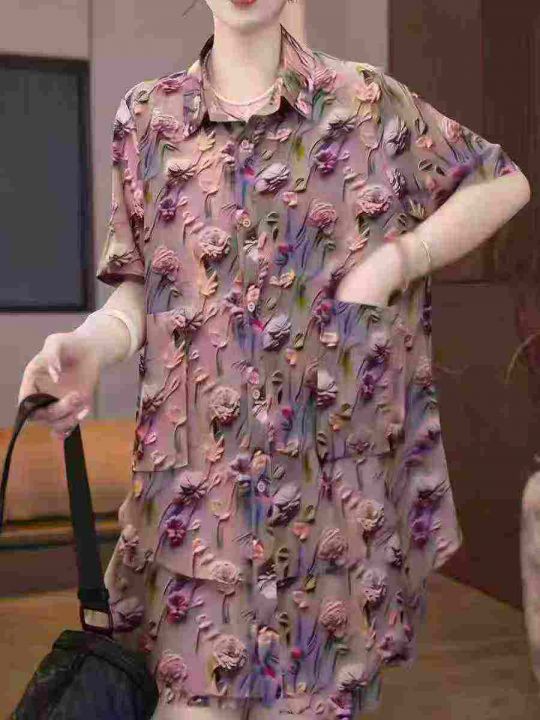 [月亮]:时尚宽松纽扣衬衣短裤两件套套装