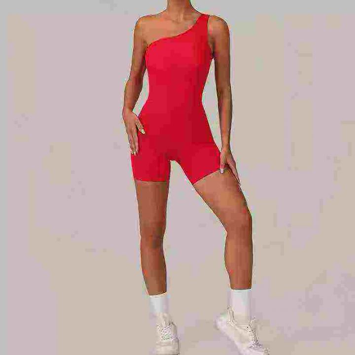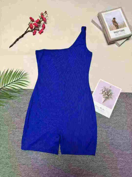欧美时尚纯色冰丝斜肩短裤连体衣,整款五色,数量:436套,码数:S-2XL,高弹力品质好,有独立包装。