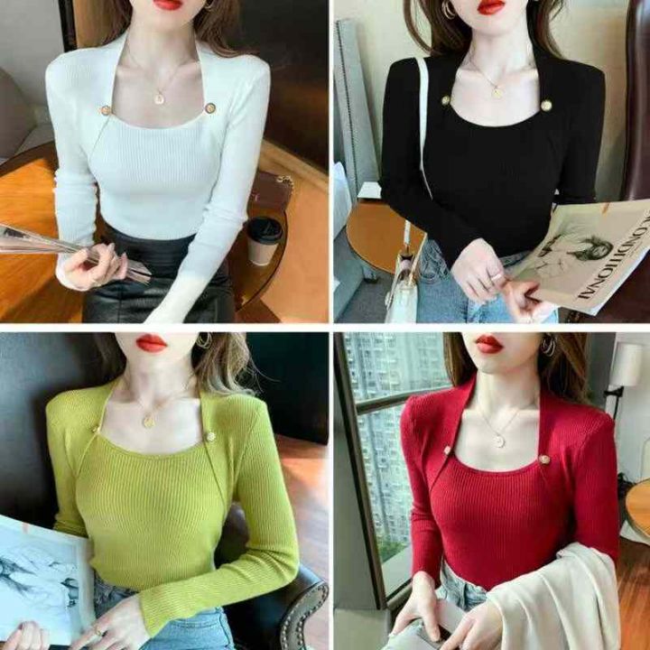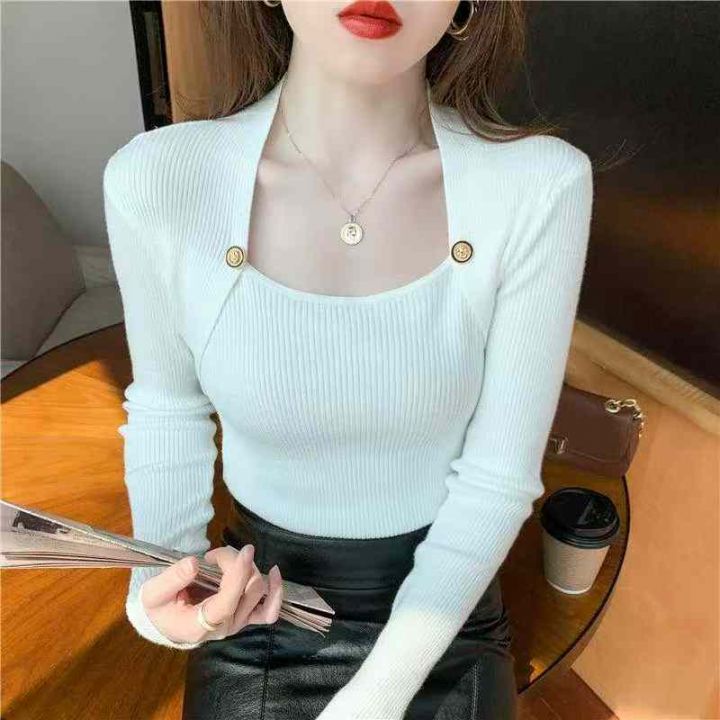 春秋季新款法式方领弹力修身显瘦包芯纱套头毛衣,独立...
