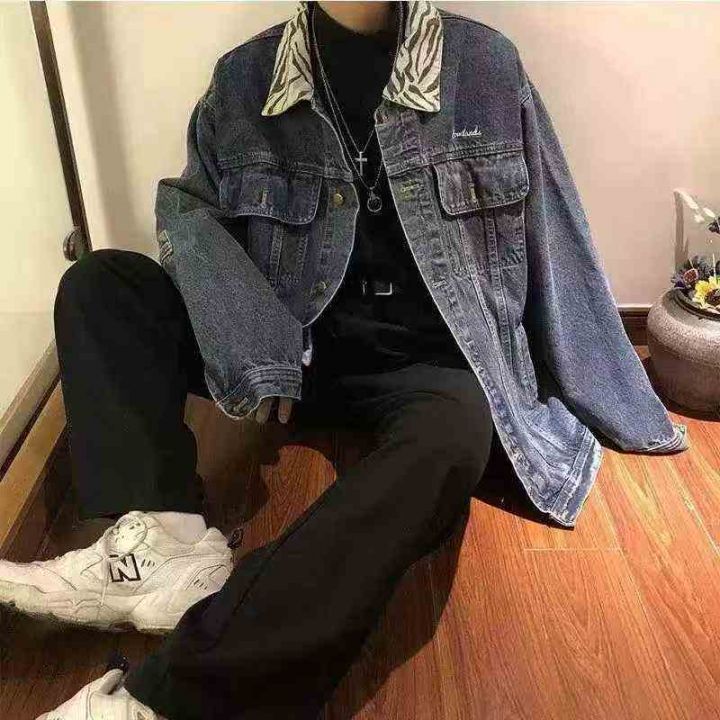 美式复古oversize斑马纹领牛仔外套男生秋季高街潮牌宽...